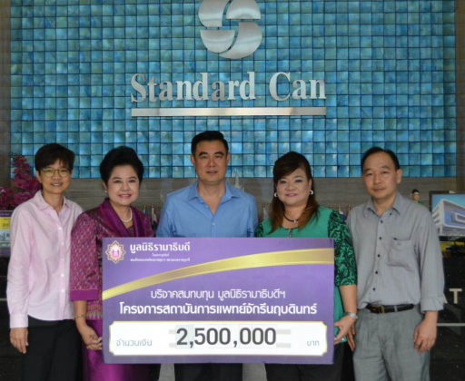 บริษัท แสตนดาร์ดแคน จำกัด มอบเงินบริจาค 2,500,000 บาท สมทบทุนโครงการสถาบันการแพทย์จักรีนฤบดินทร์ แก่มูลนิธิรามาธิบดีฯ โดยคุณสาธิต–คุณเพ็ชรวดี ชยาวิวัฒน์กุล ร่วมมอบ และคุณมาลี สังวาลเล็ก เป็นผู้รับมอบ